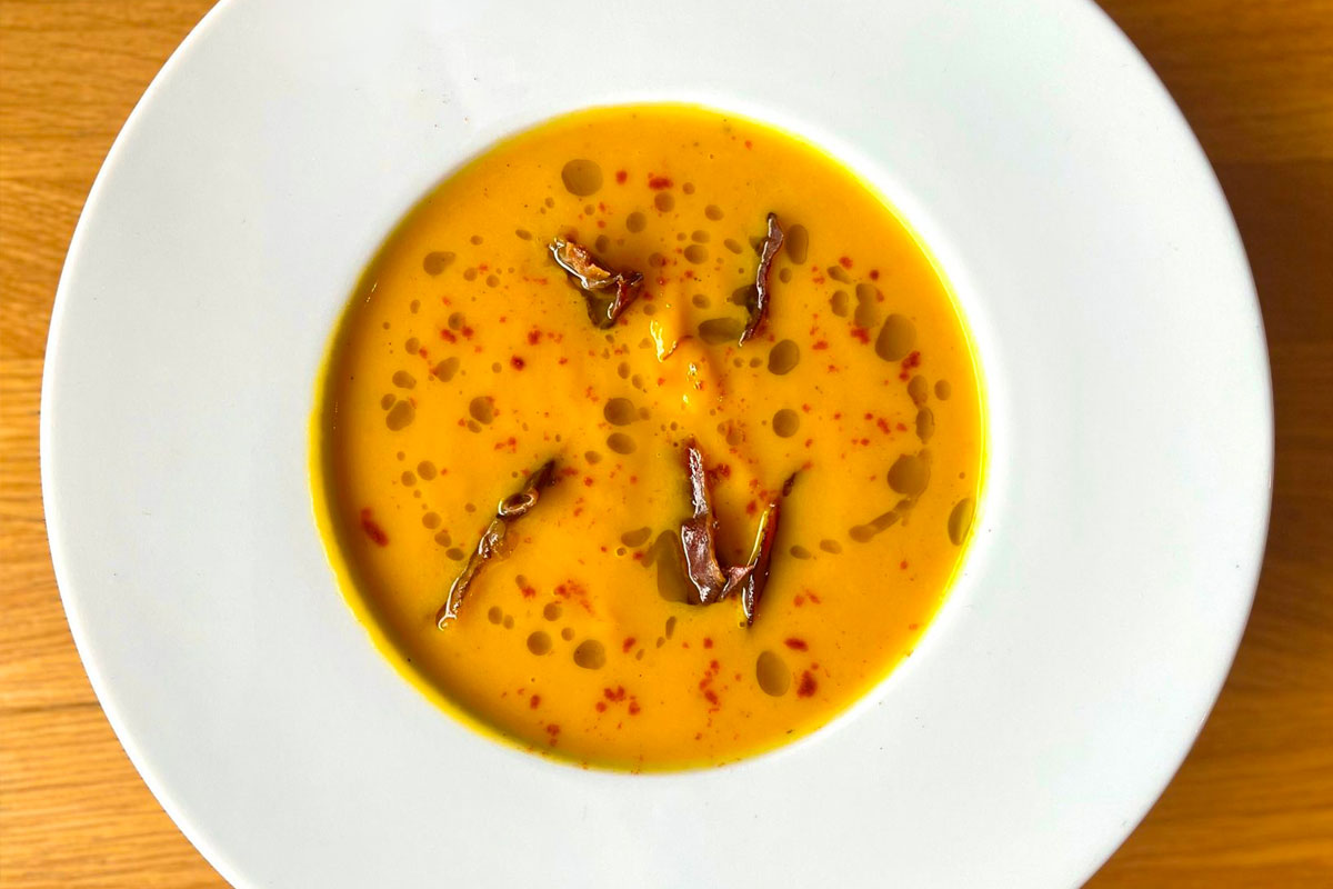 Velouté de courges, chips de lard, huile d’herbes