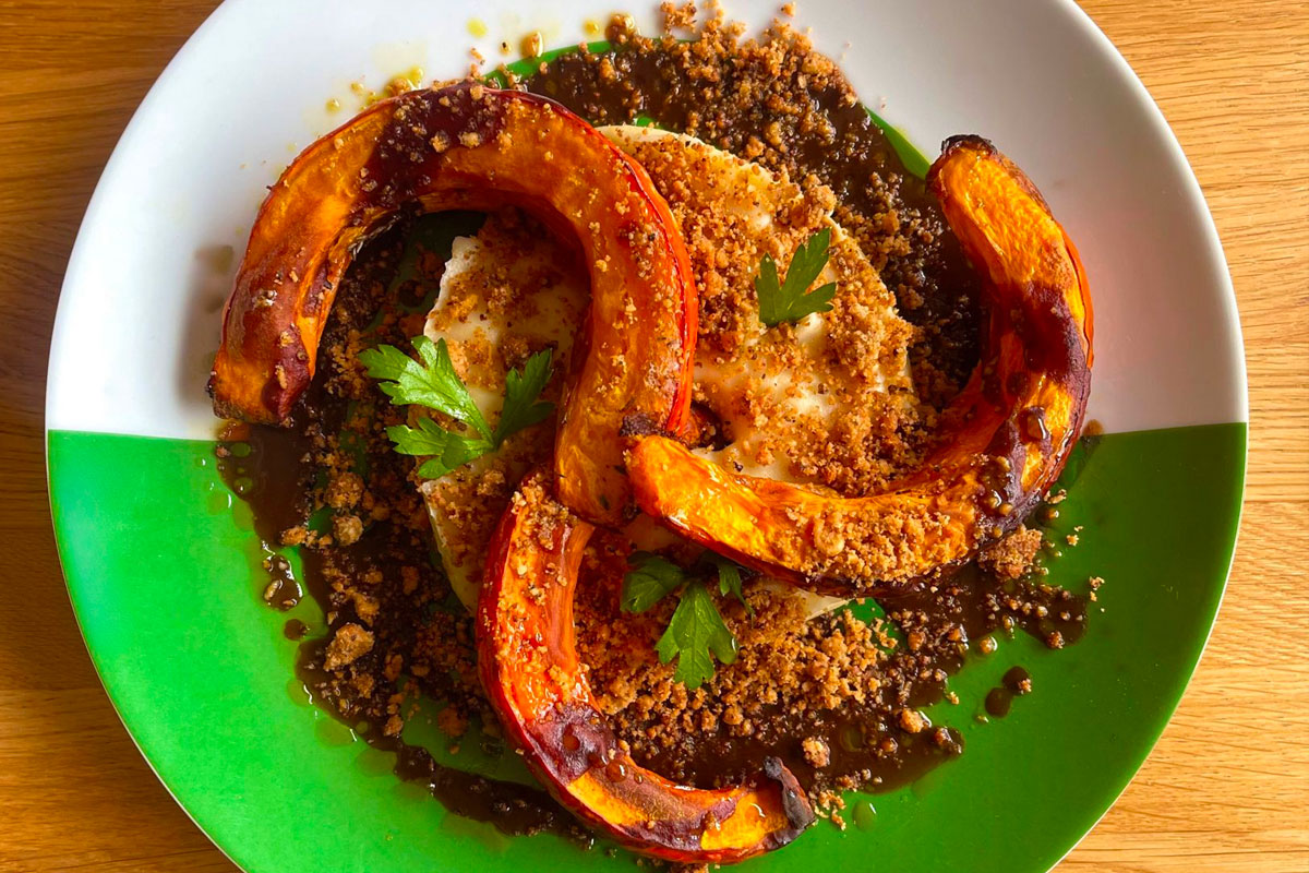 Steak de potimarron rôti au miel, purée de panais, jus de légumes, crumble