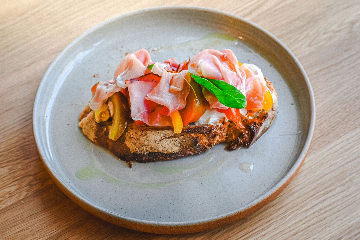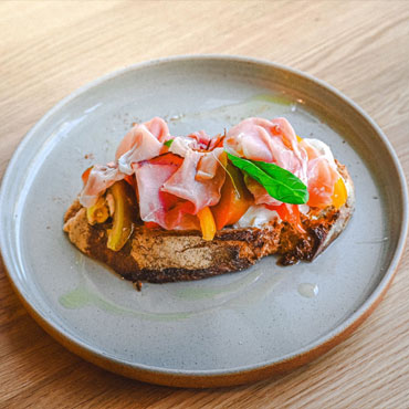 Tartine tomate d’antan, stracciatella et jambon de pays