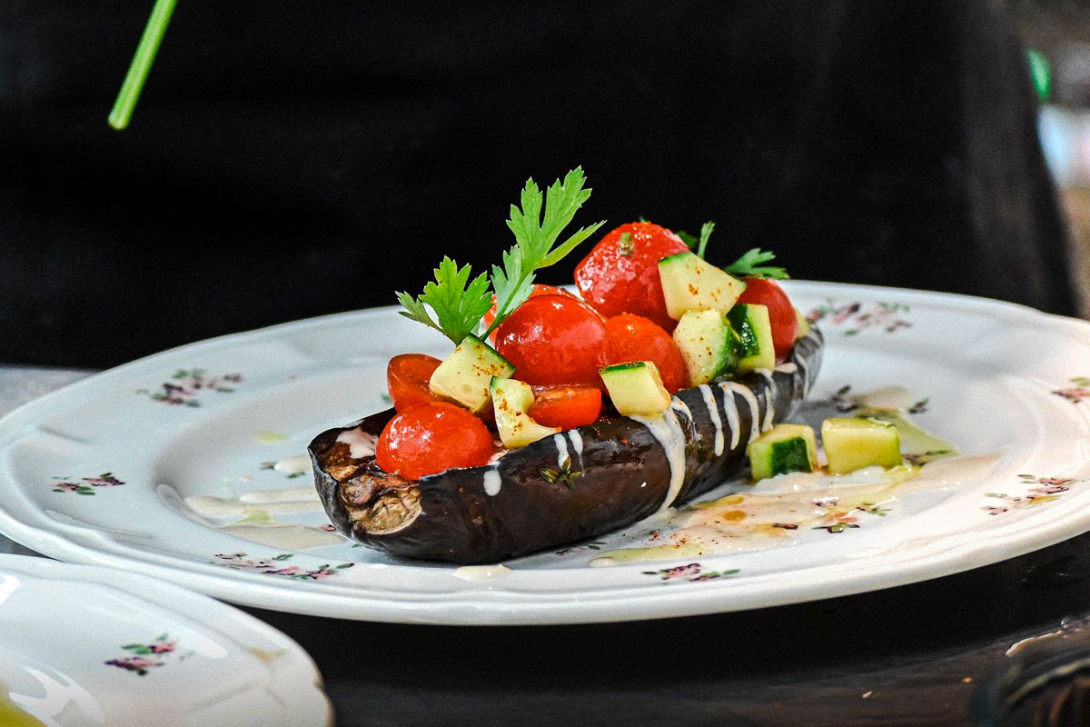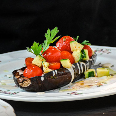 Aubergine rôtie, sauce tahini, concombre et tomates