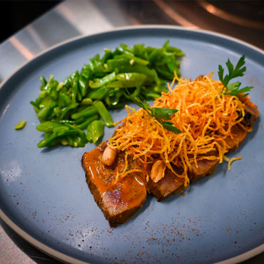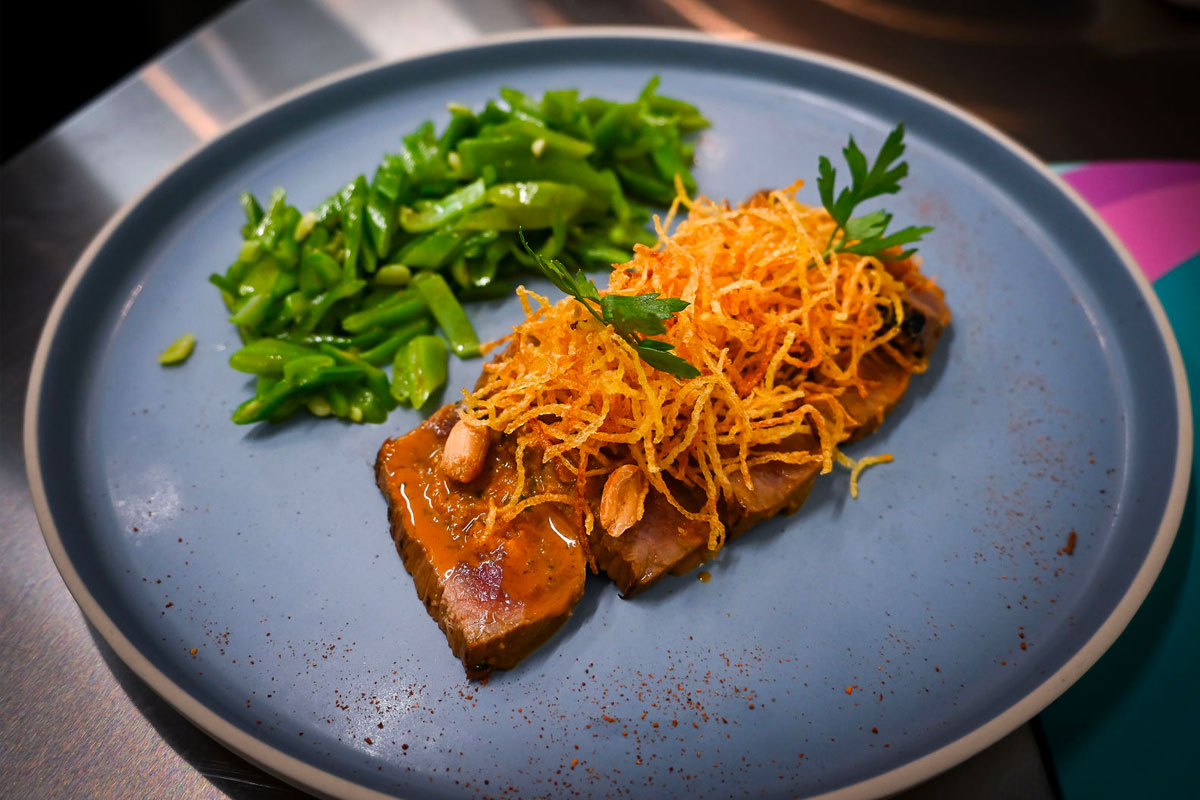 Tataki bœuf, pommes pailles, haricots, sauce soja, cacahuètes