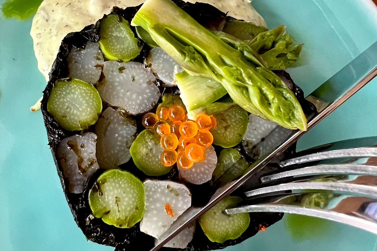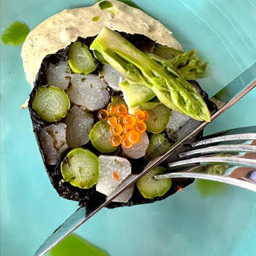 Asperges, feuille de nori, sauce gribiche, ail des ours